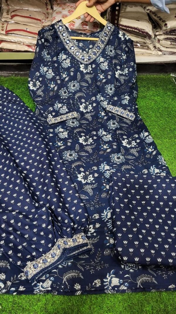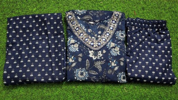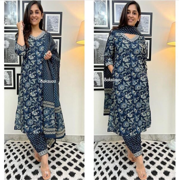 Vew in our beautiful indigo printed kurti with Afghani bottoms with embroidery work with cotton dupatta perfect for every day
