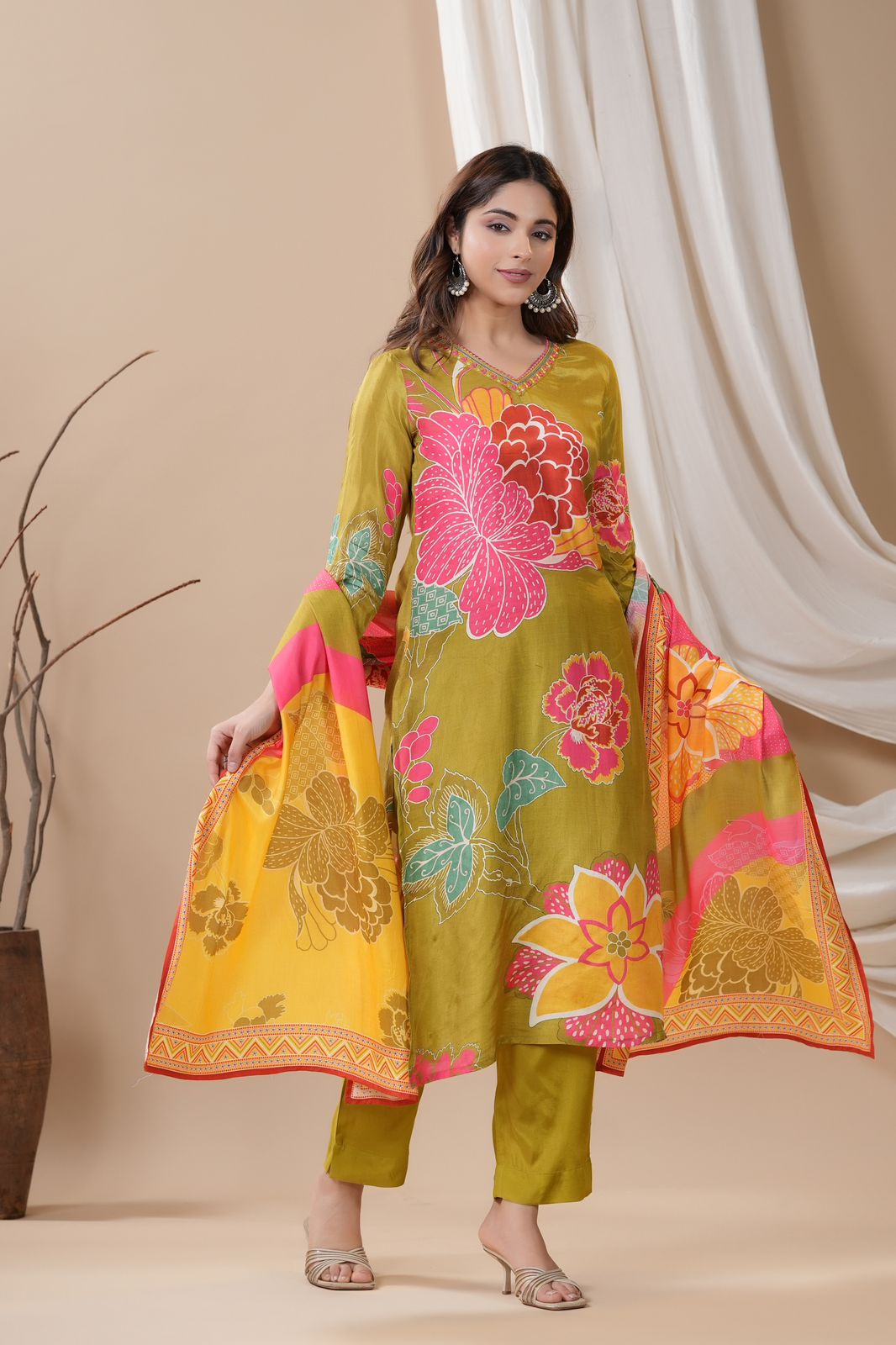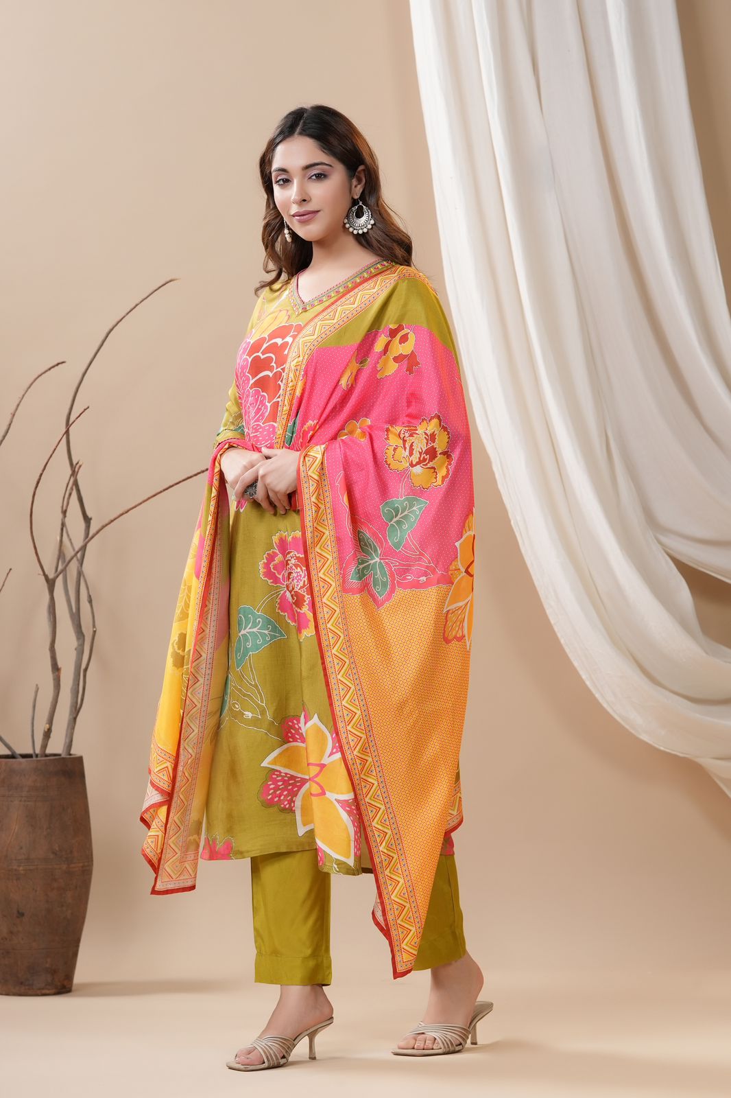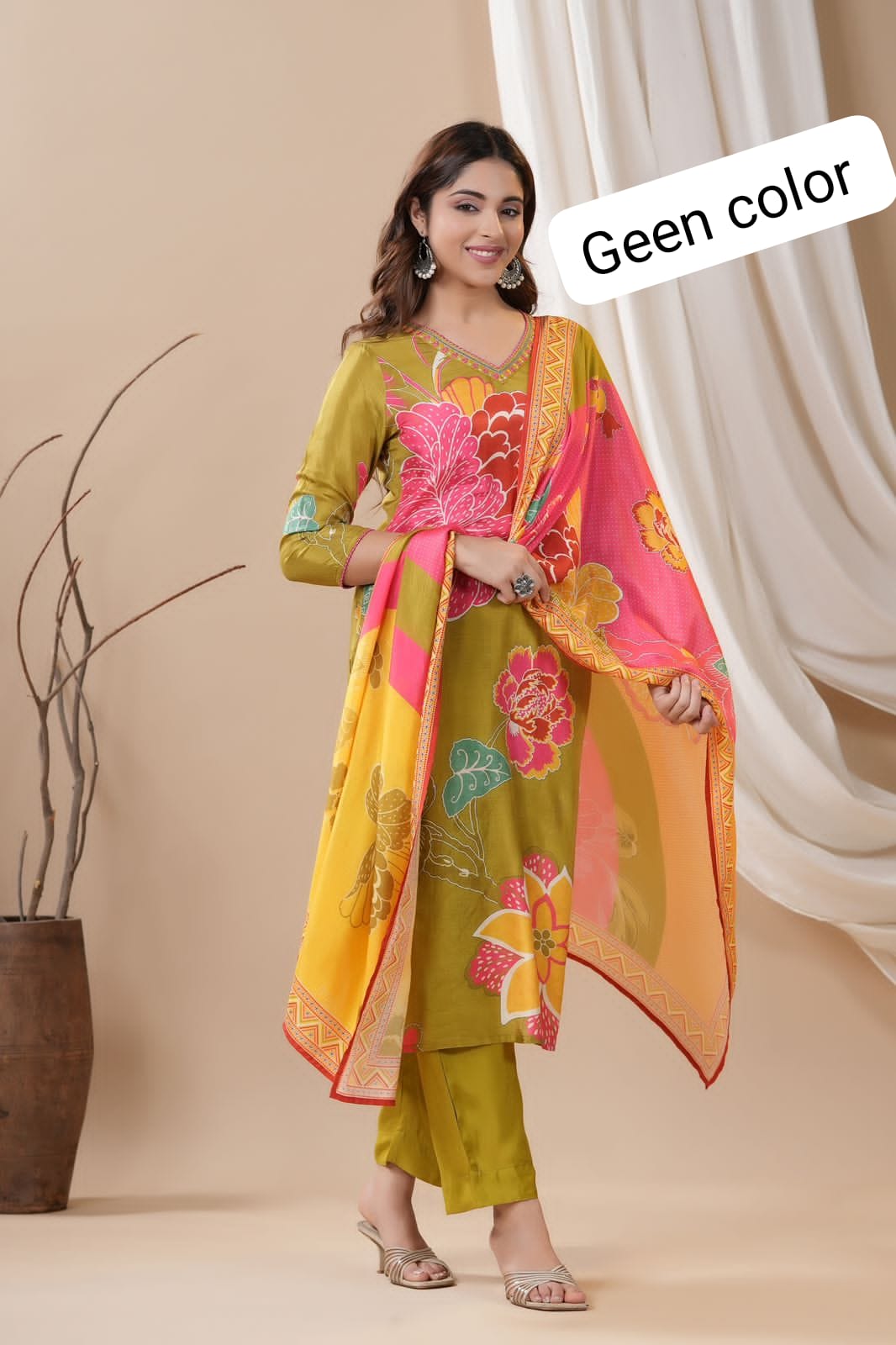 Muslin digital print kurti with Cotton pent Maslin dupatta set