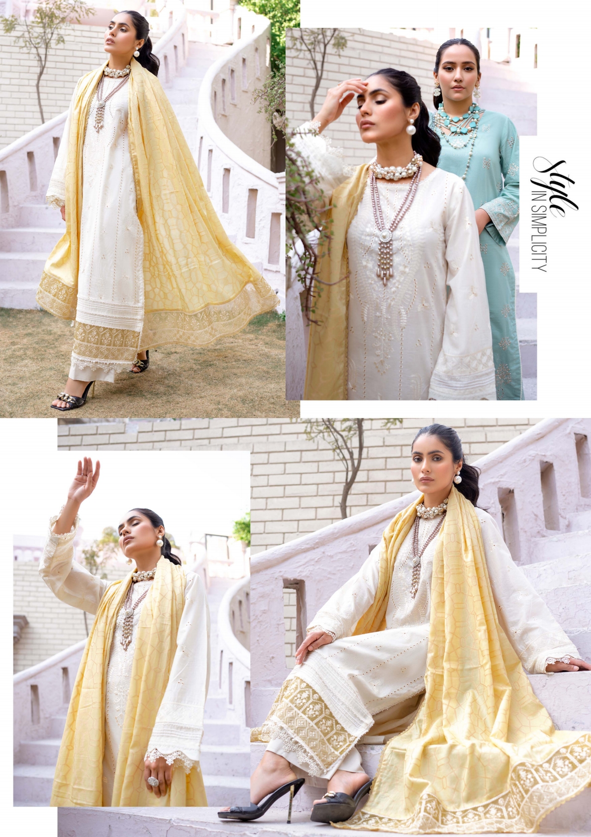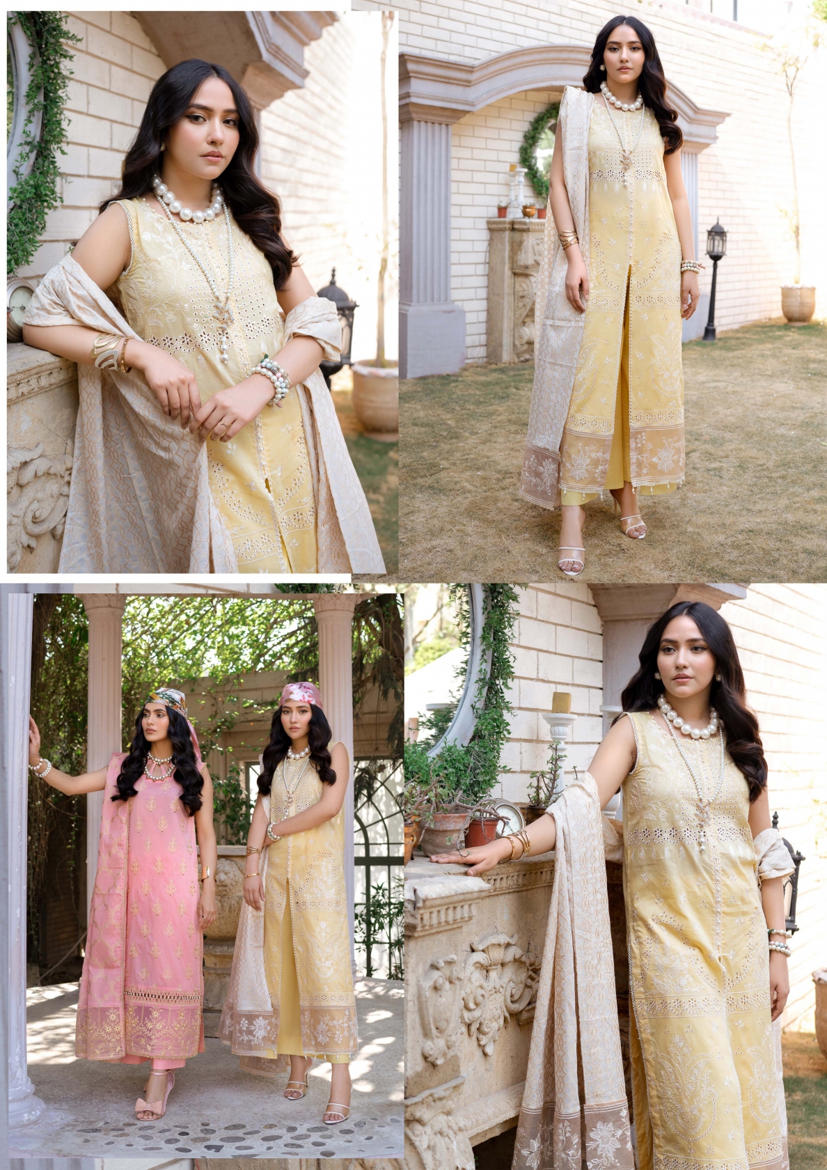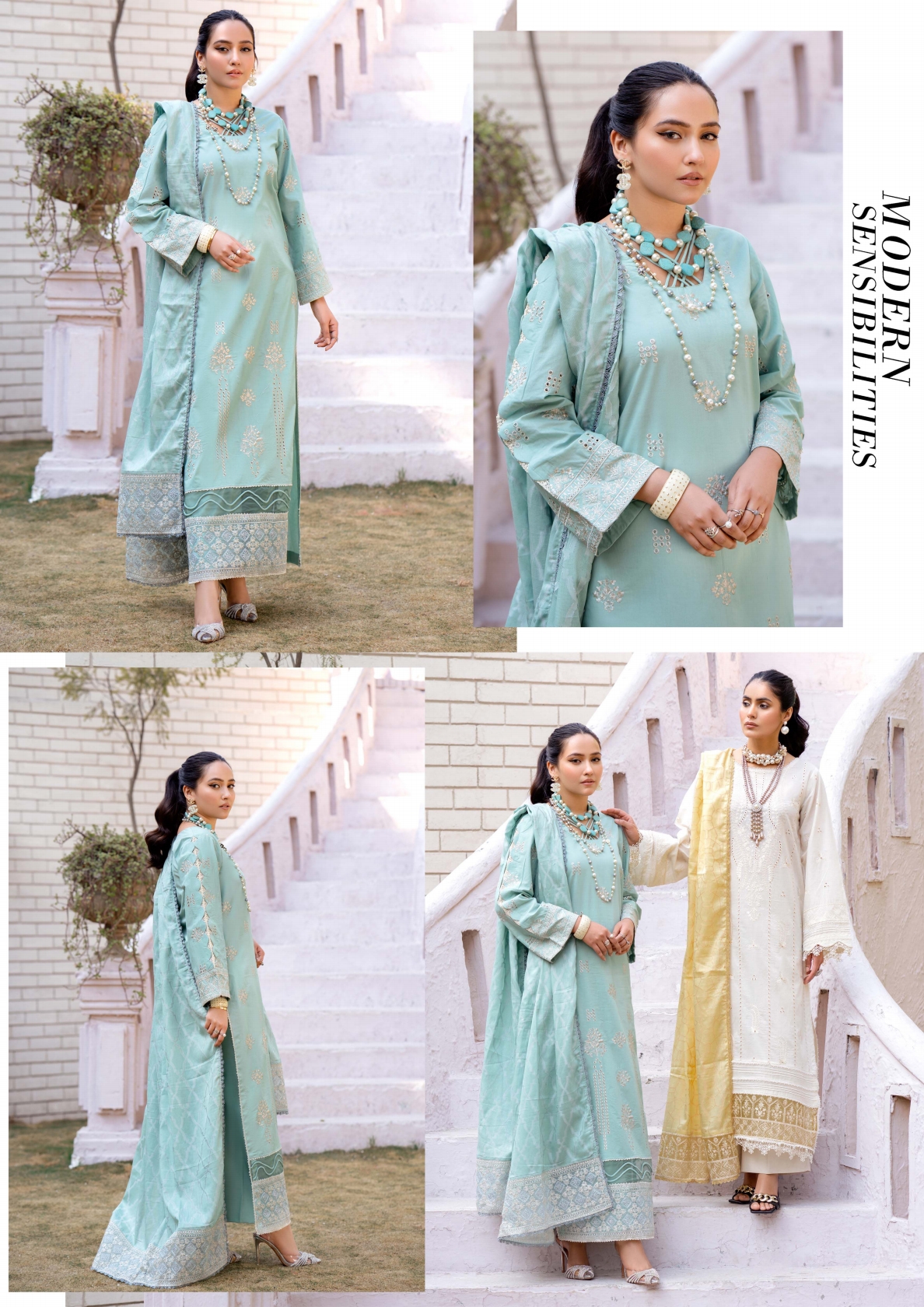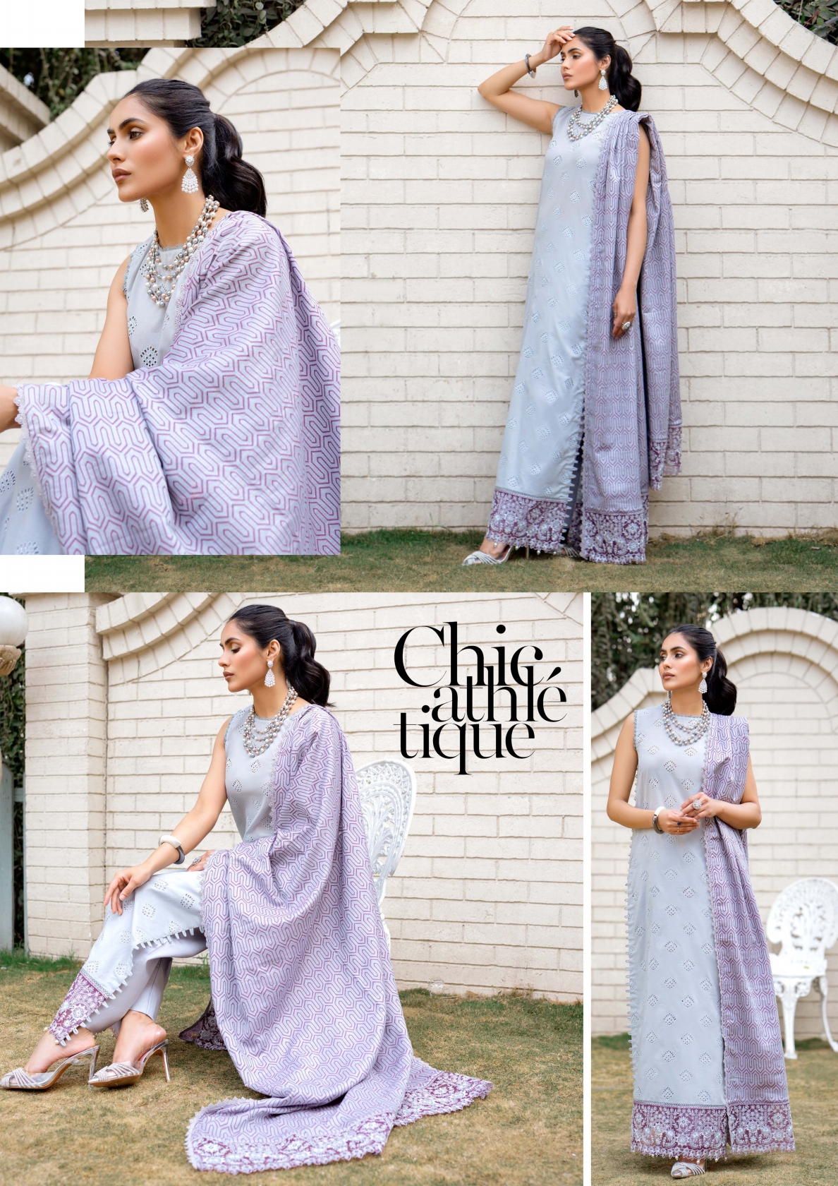 EMBROIDERED LAWN CHICKENKARI SHIRT WITH COTTON NET JACQUARD DUPATTA WITH PALLU EMBROIDERY AND PLAIN COTTON TROUSER