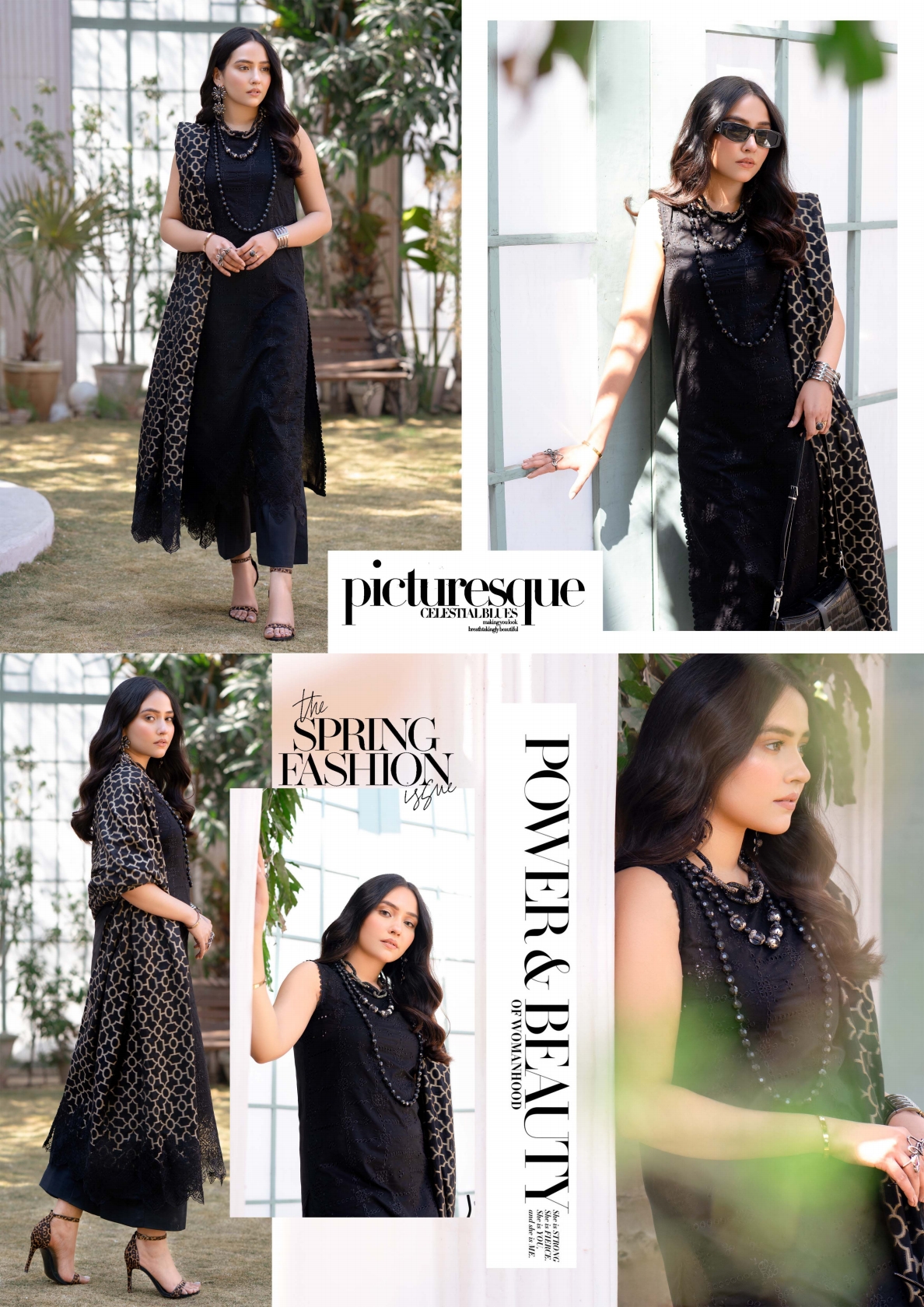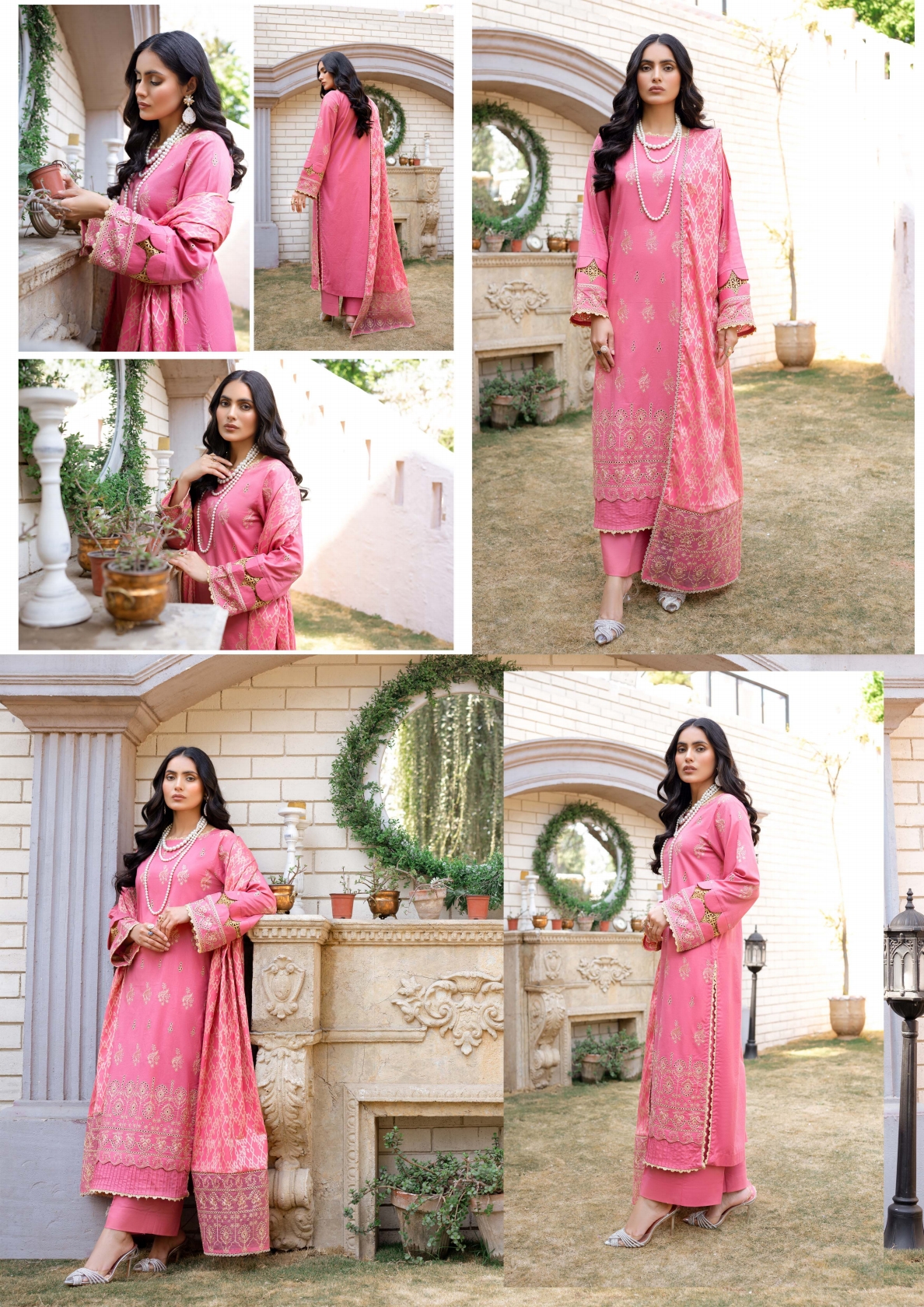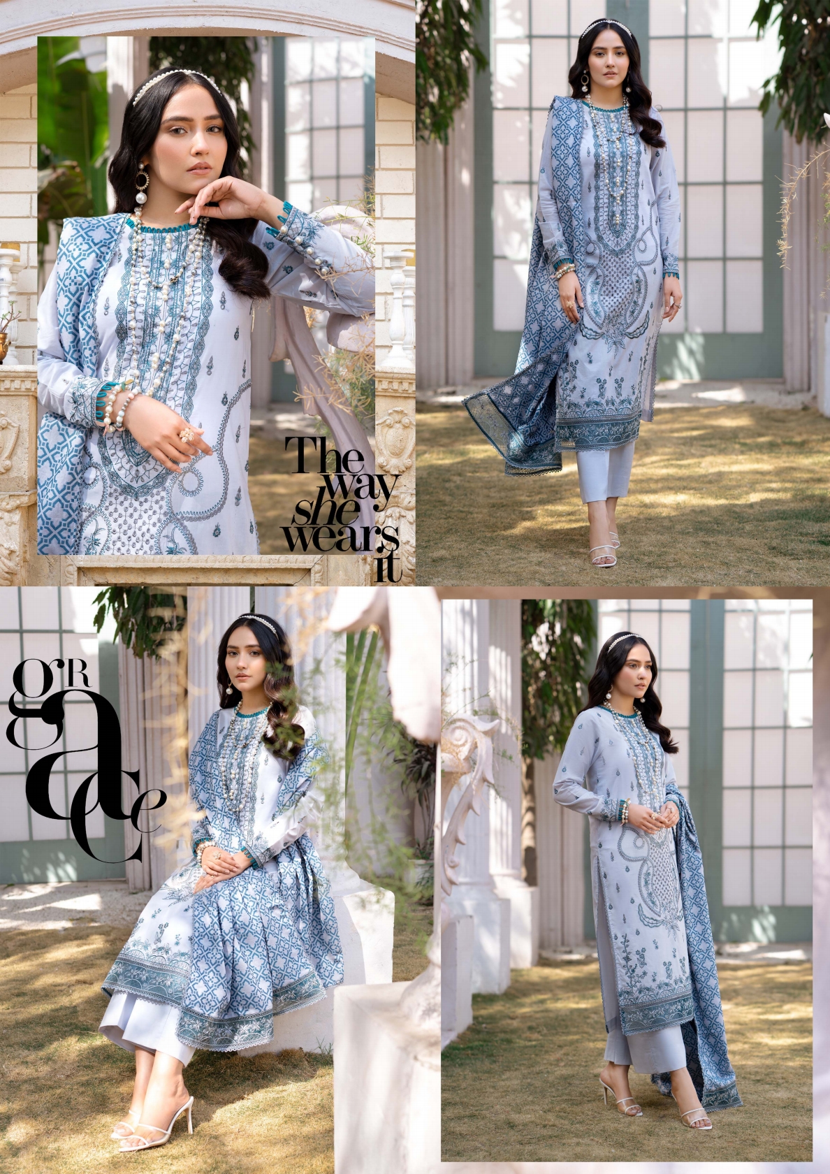 EMBROIDERED LAWN CHICKENKARI SHIRT WITH COTTON NET JACQUARD DUPATTA WITH PALLU EMBROIDERY AND PLAIN COTTON TROUSER