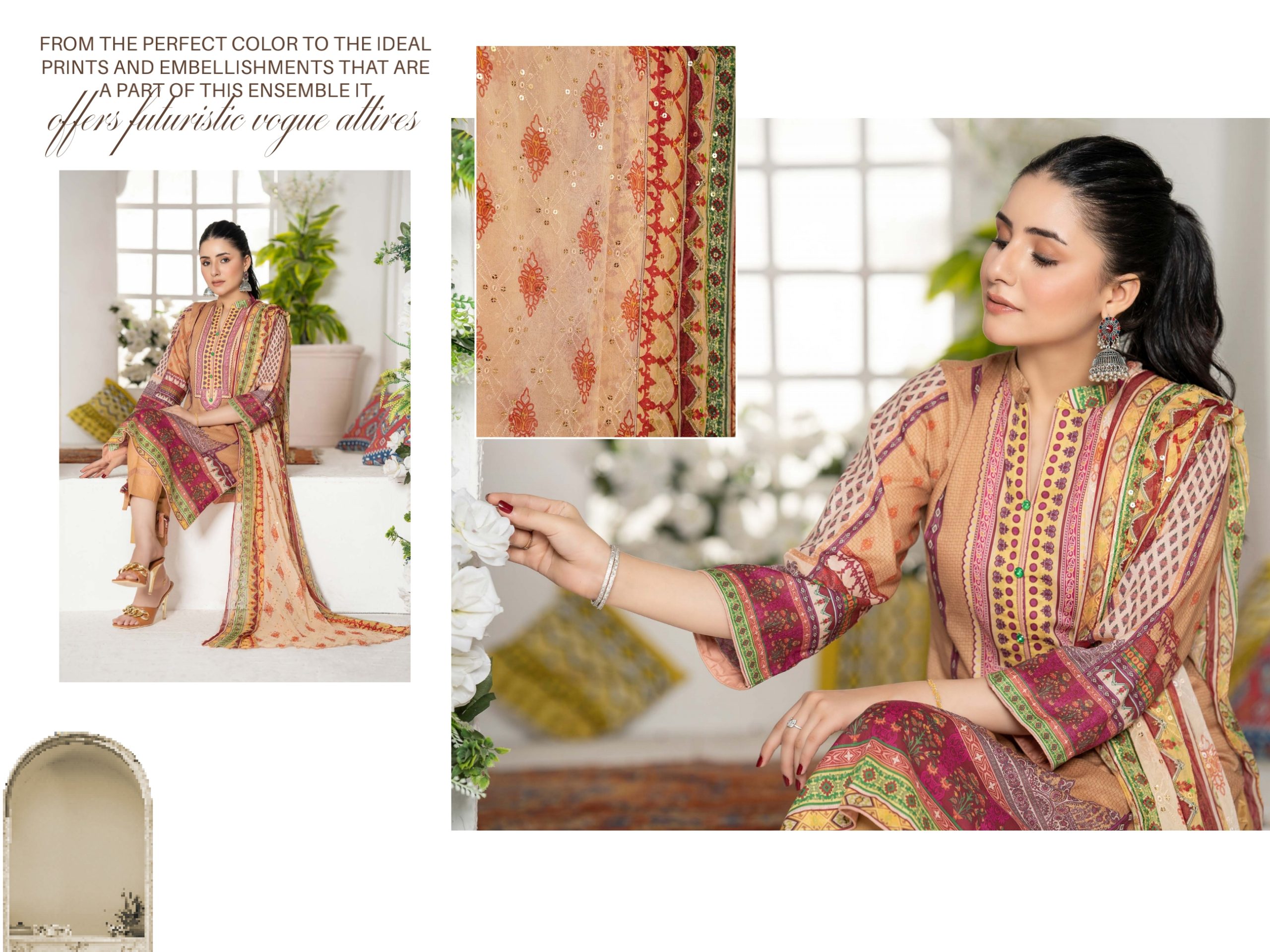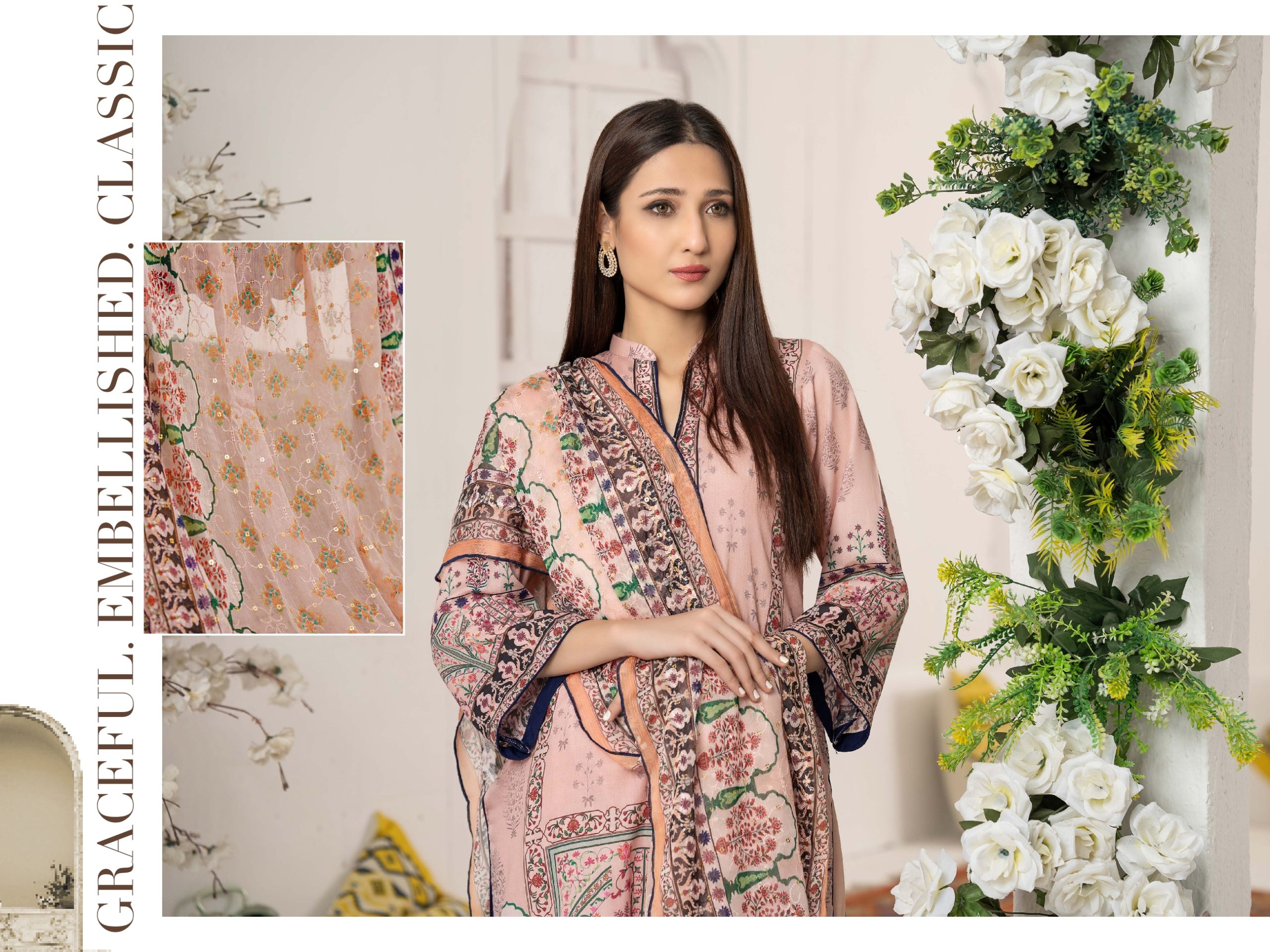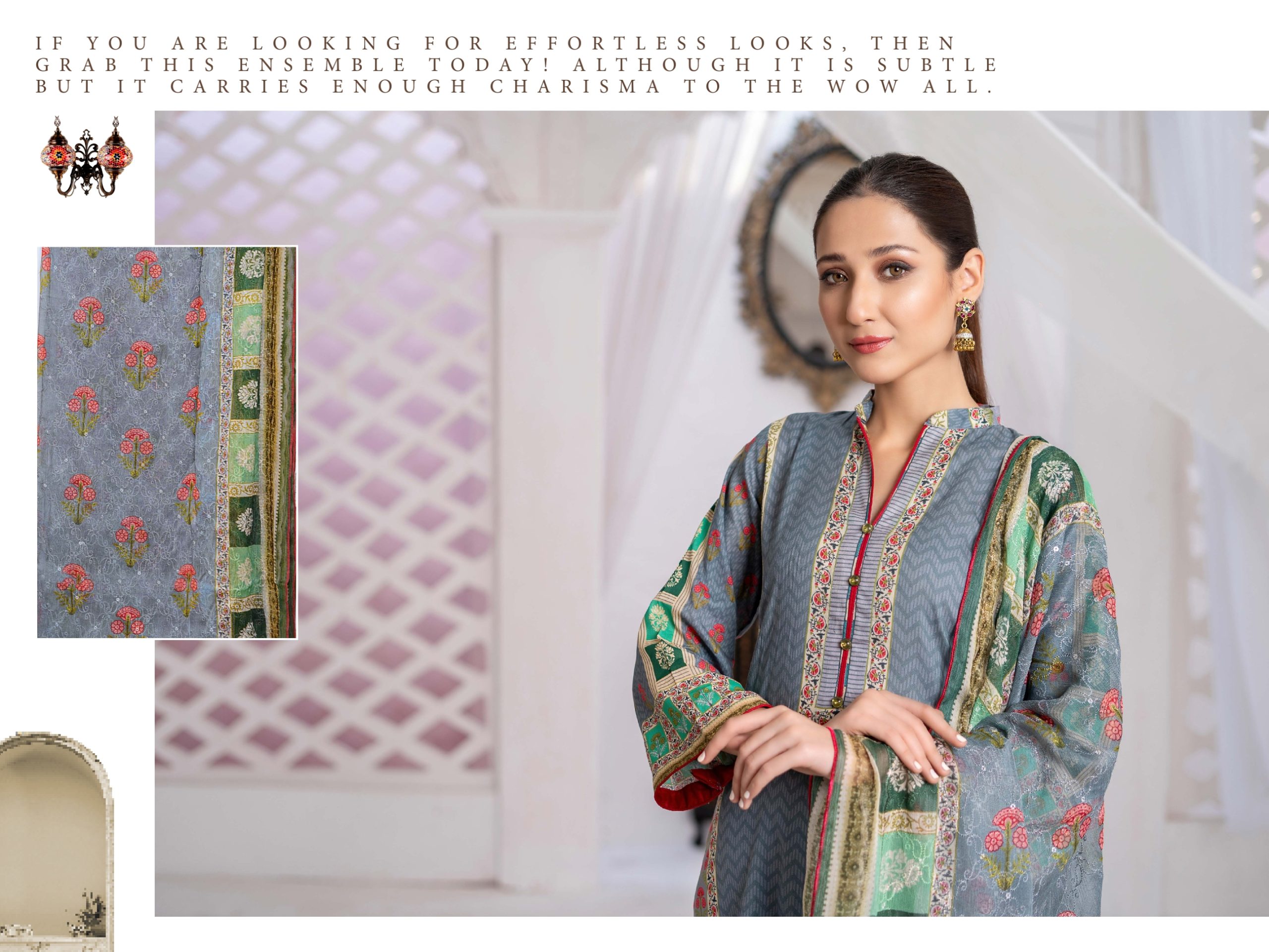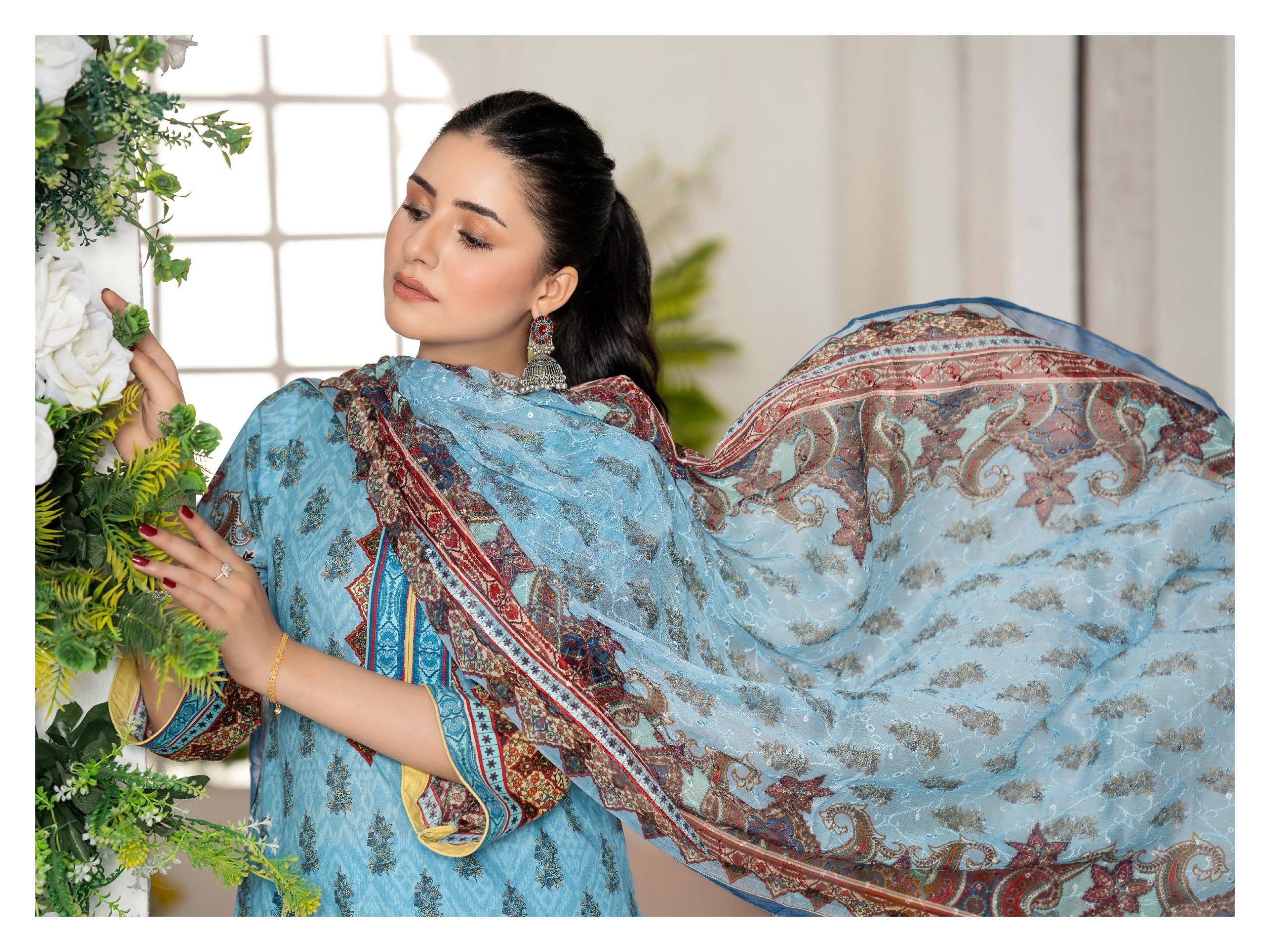 Digital Printed Airjet Lawn Shirts, with *Digital Printed Chikankari Sequence Embroidered Dupattas* & Dyed Trousers.