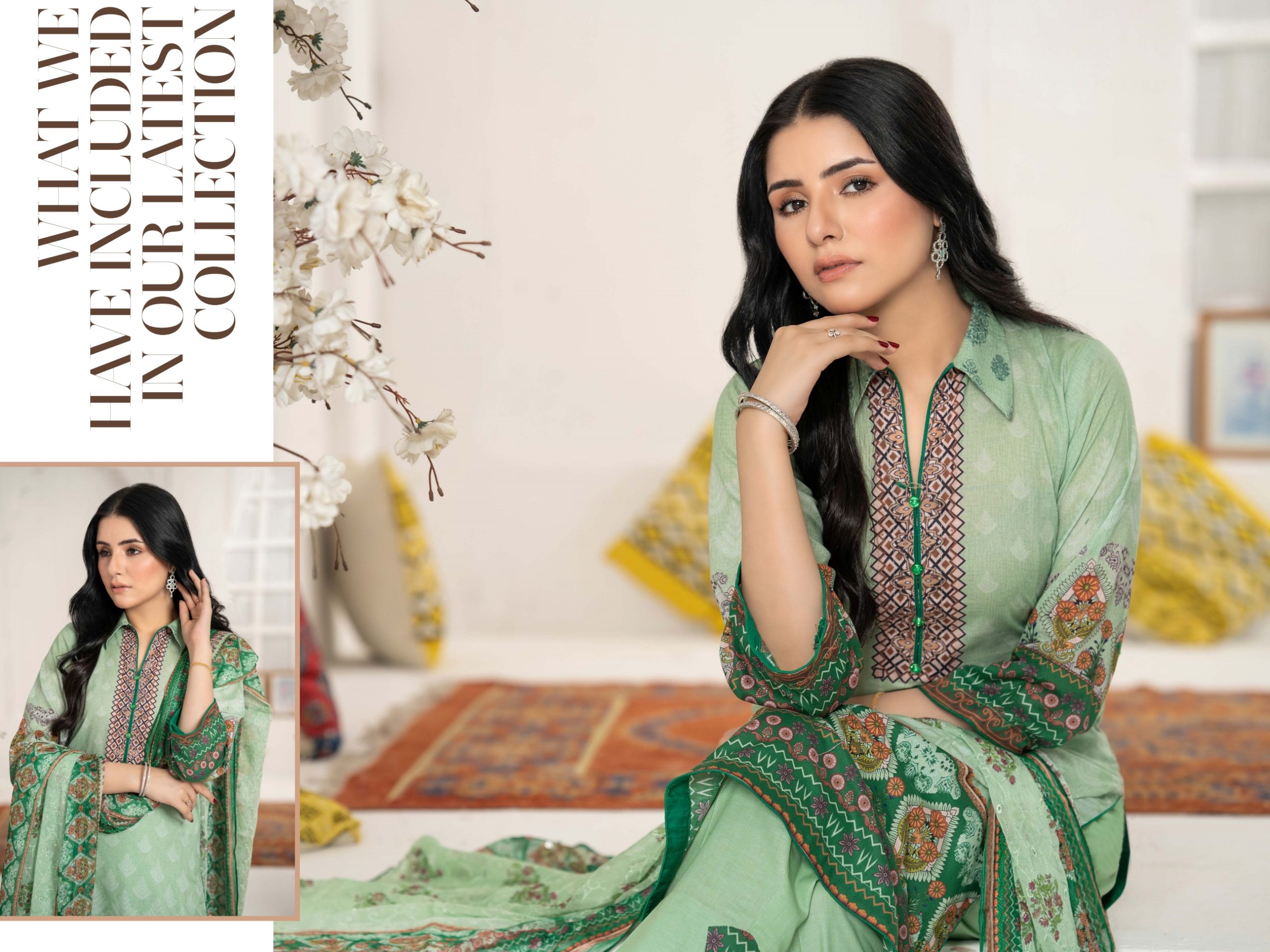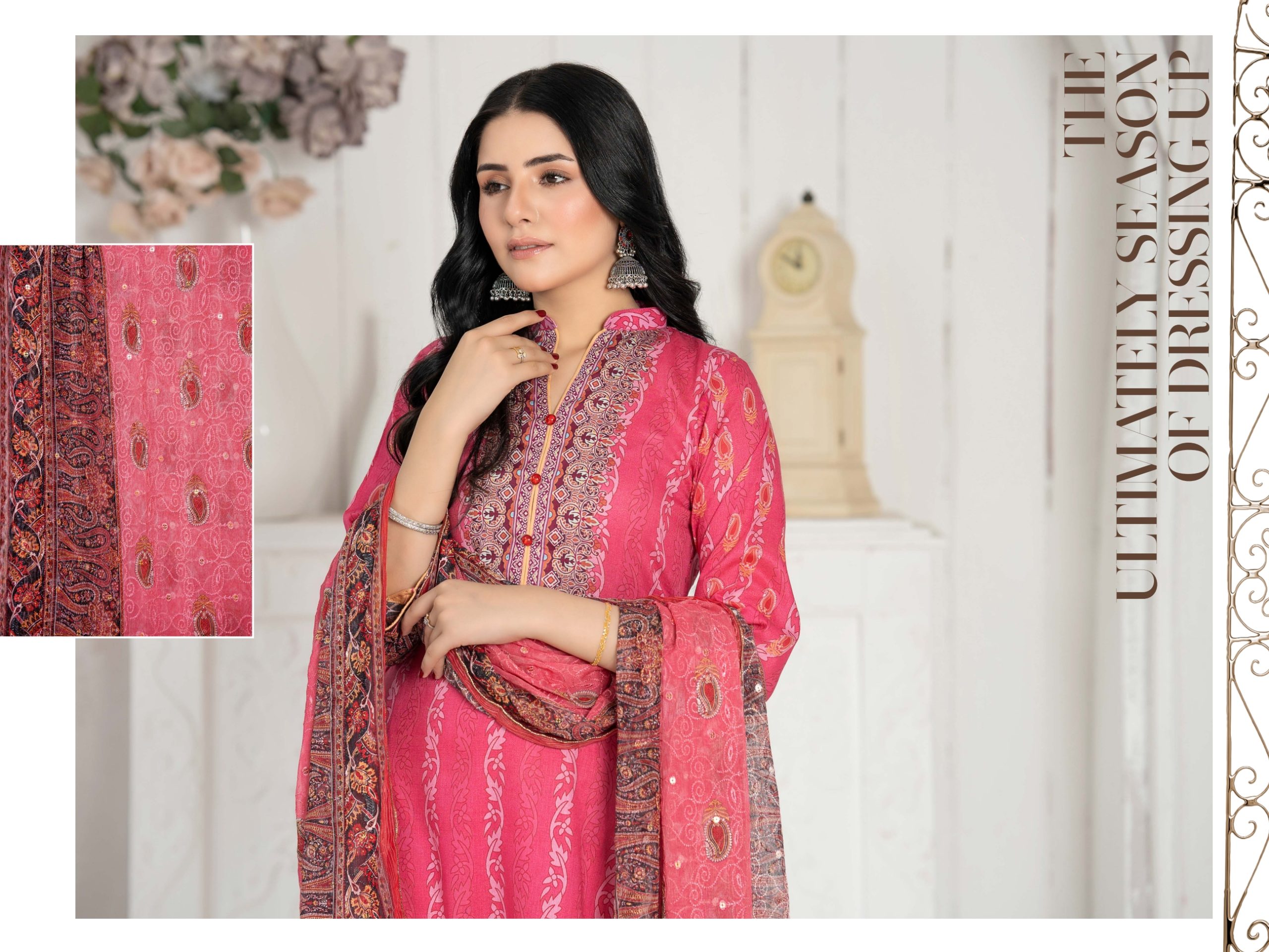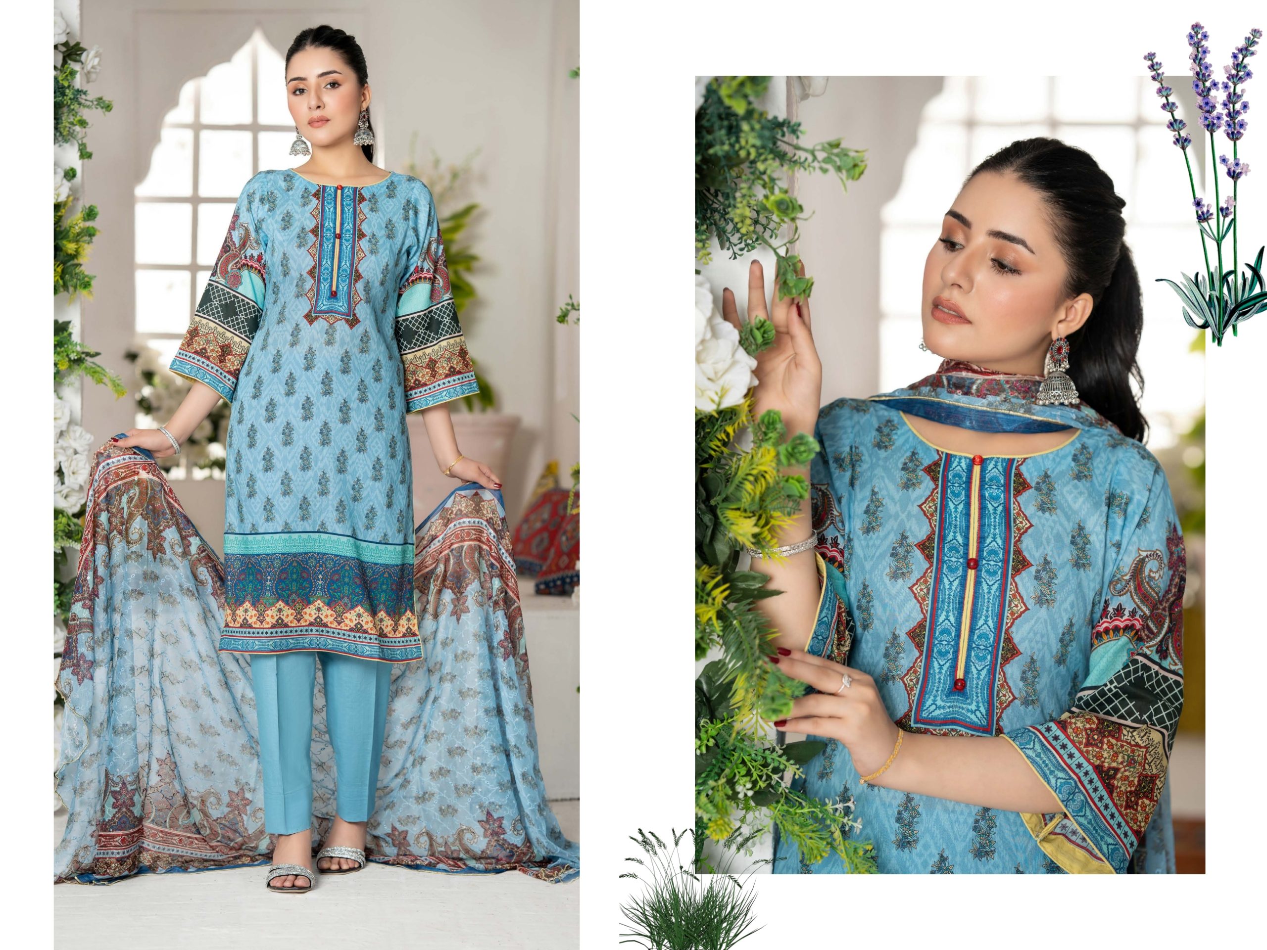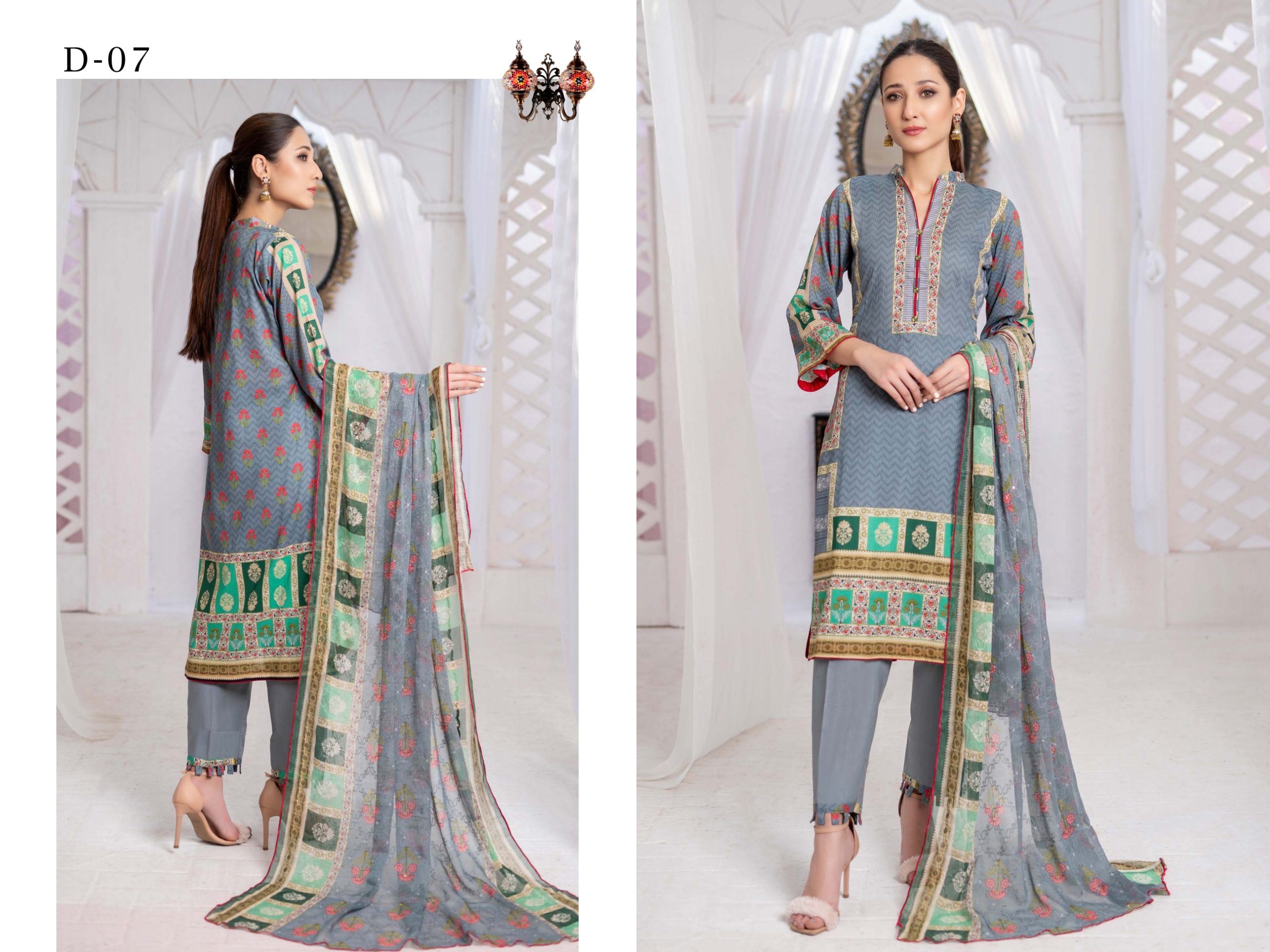 Digital Printed Airjet Lawn Shirts, with *Digital Printed Chikankari Sequence Embroidered Dupattas* & Dyed Trousers.