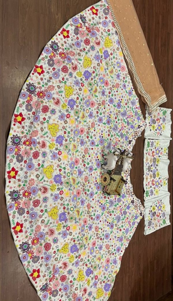 *Launching 3.5 Meter Flare 9 Color Thread Work Heavy Mono Satin Silk Sequins Embroidered work Lehenga with Cancan & Canvas Patta*