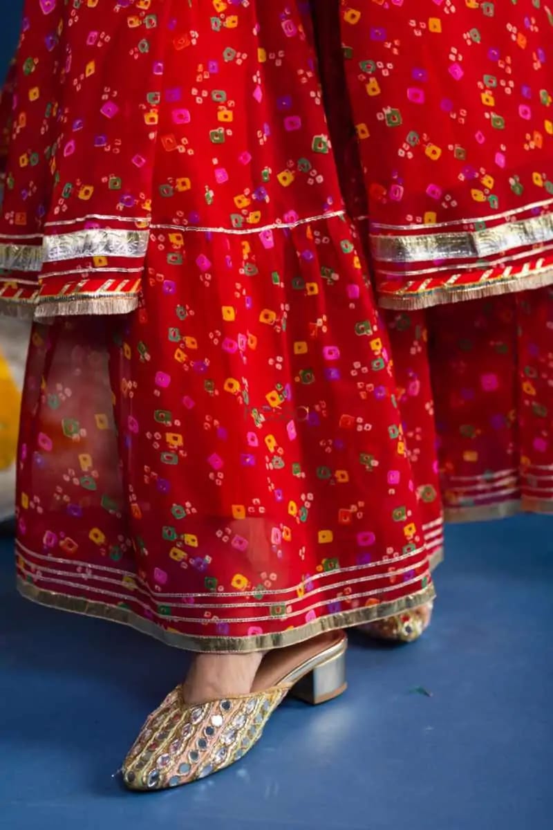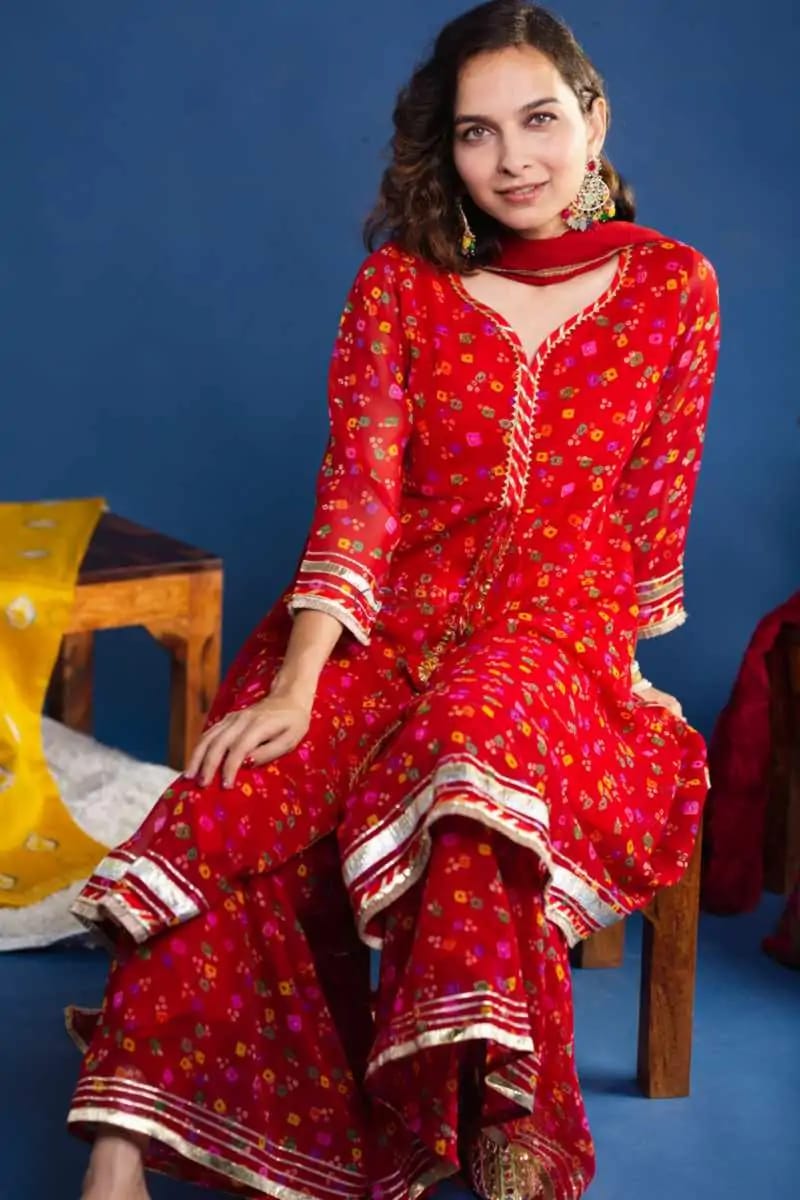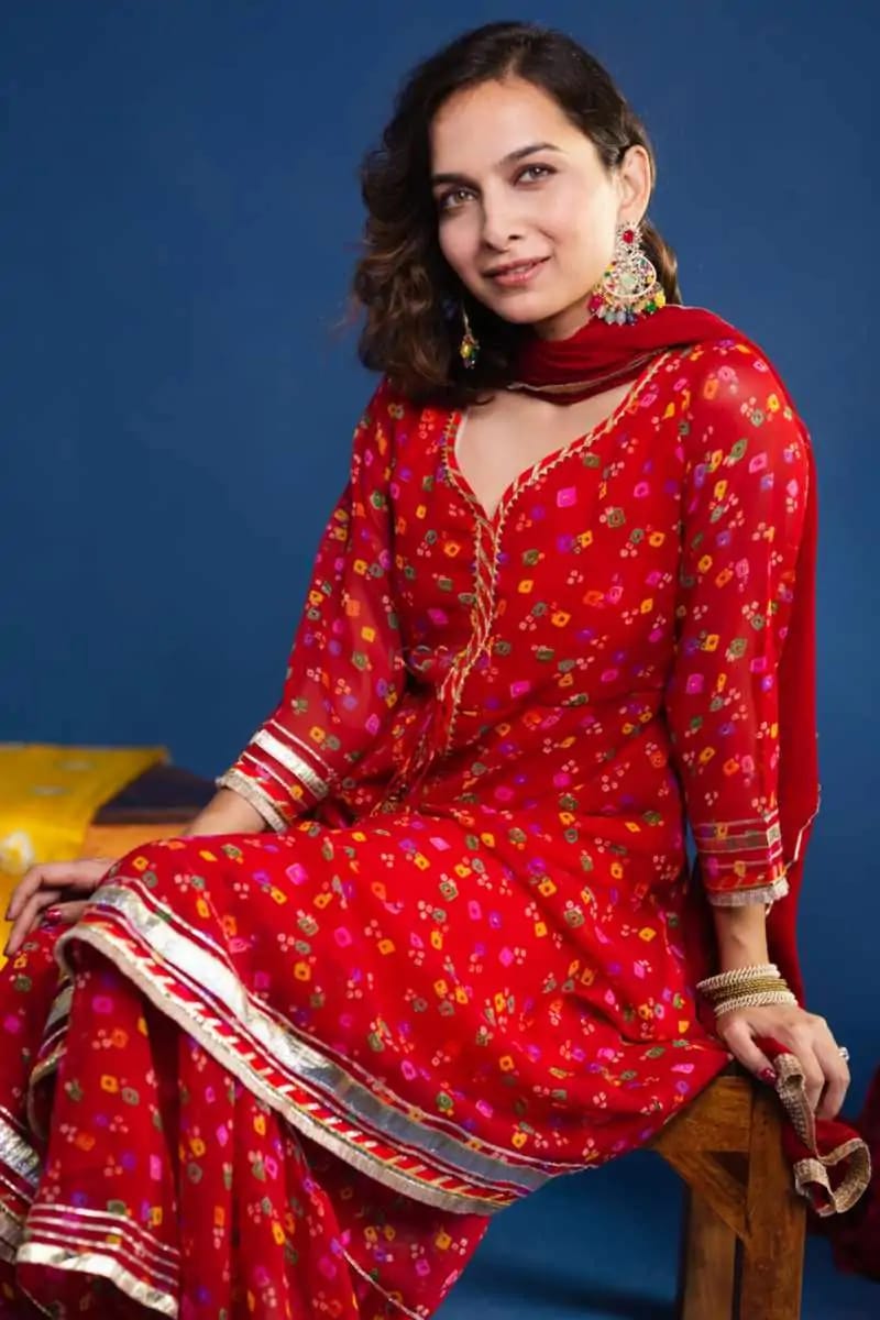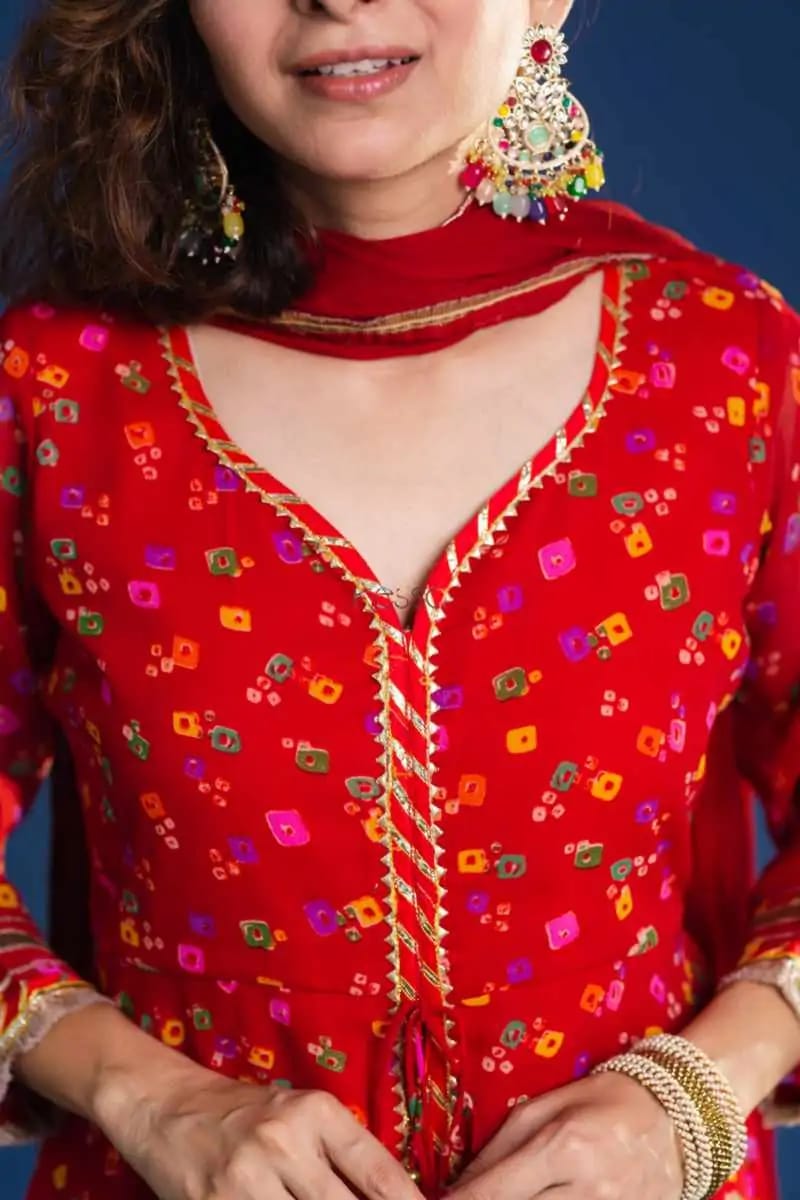 *The peppy bright red of Sunila based on Georgette is lit up further with exquisite bandhani all over print* .