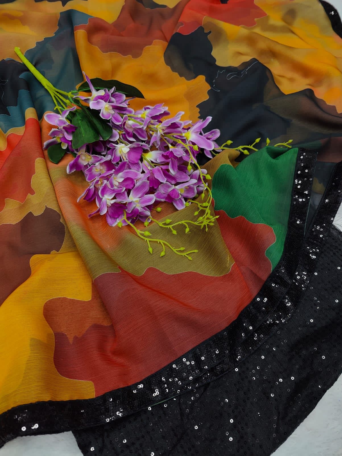 *Soft Chiffon Designer Sabyasachi PrintΒ Saree * Along With Contrast Sequence Lace & Full Work Sequence Blouse