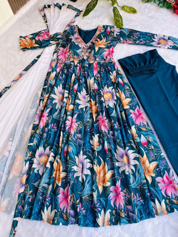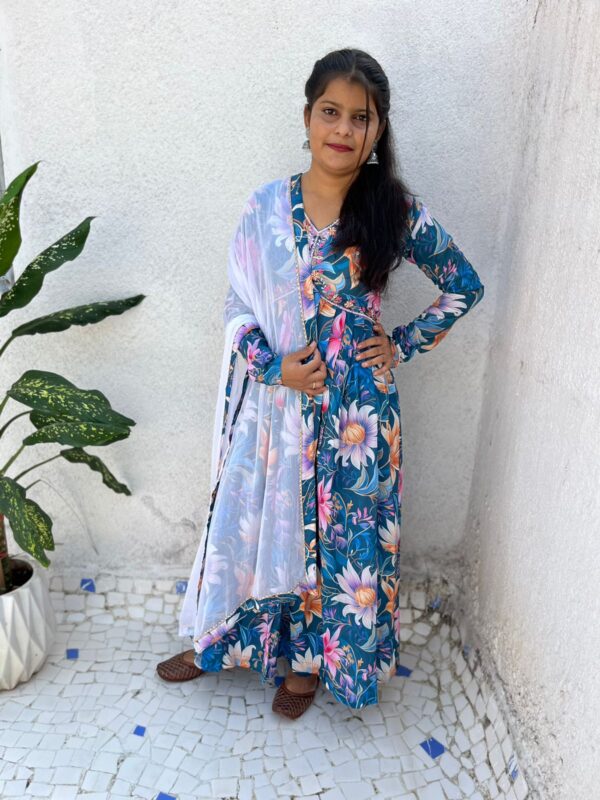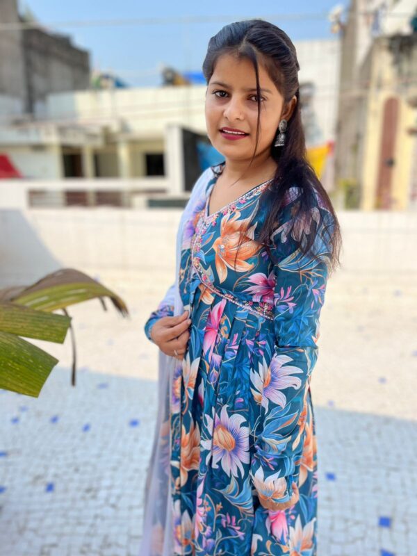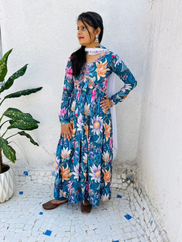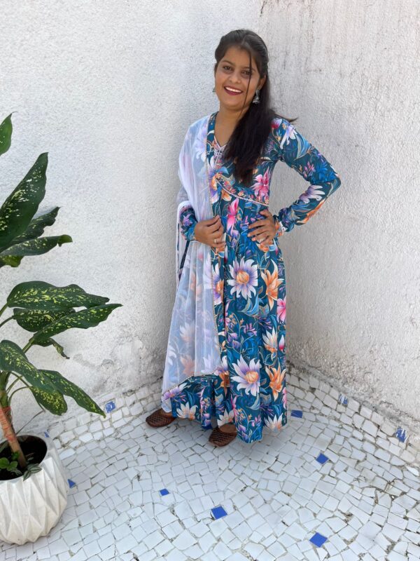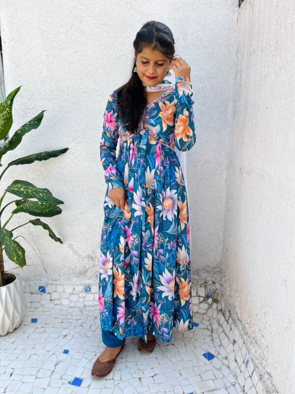 👗Dress Cotton BSY Soft With Digital Lily 💐Printed Blue Color Beautiful Hand made katli and White Paul’s, Thread Flair 3.5 MTR approx 🪷 Sleeve Length 25 +