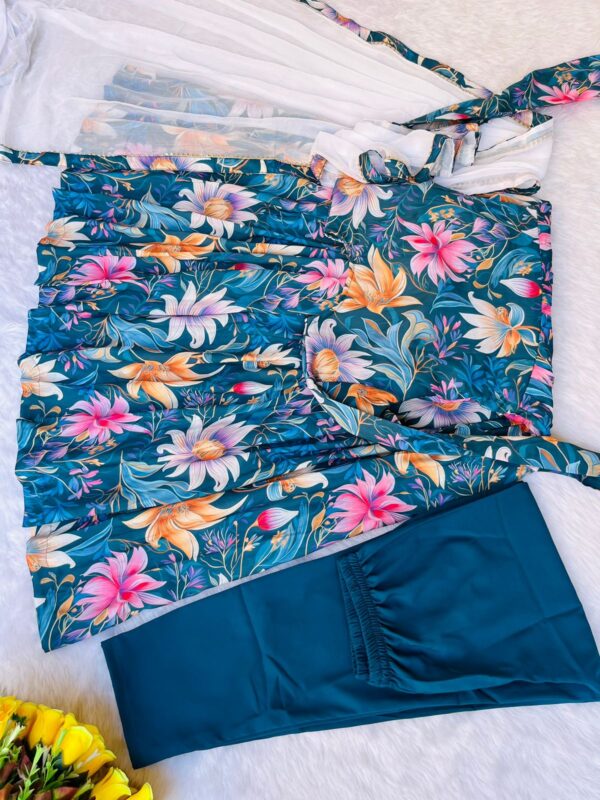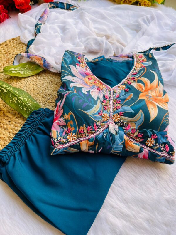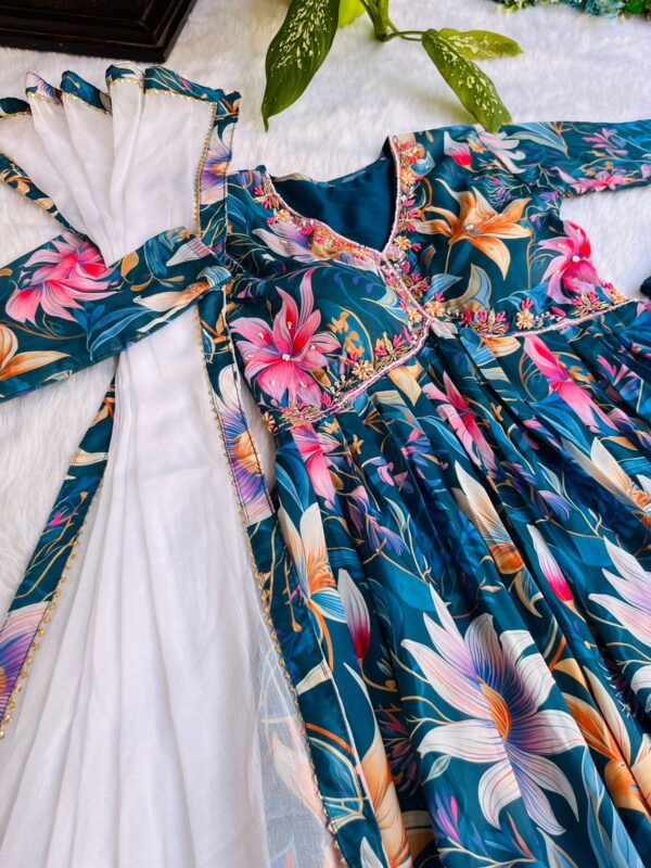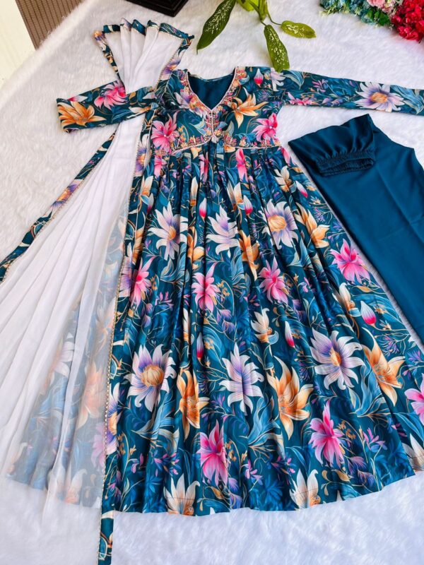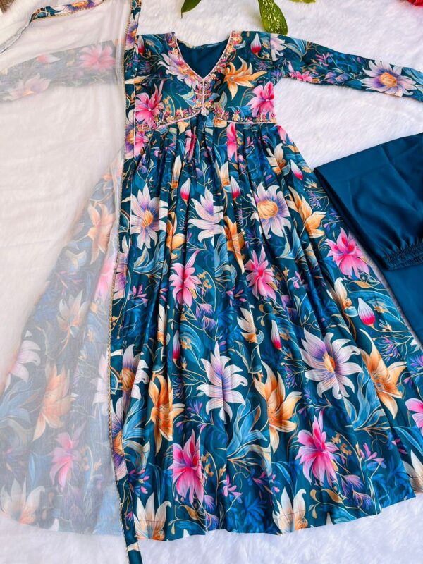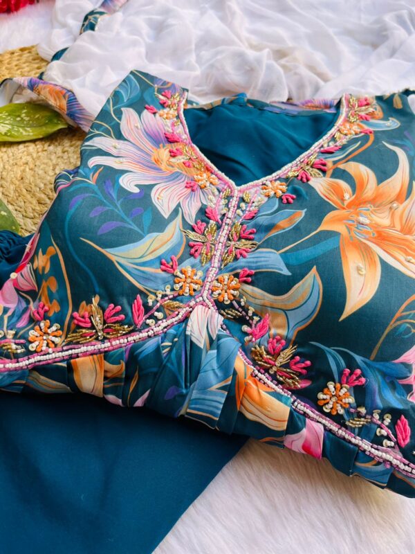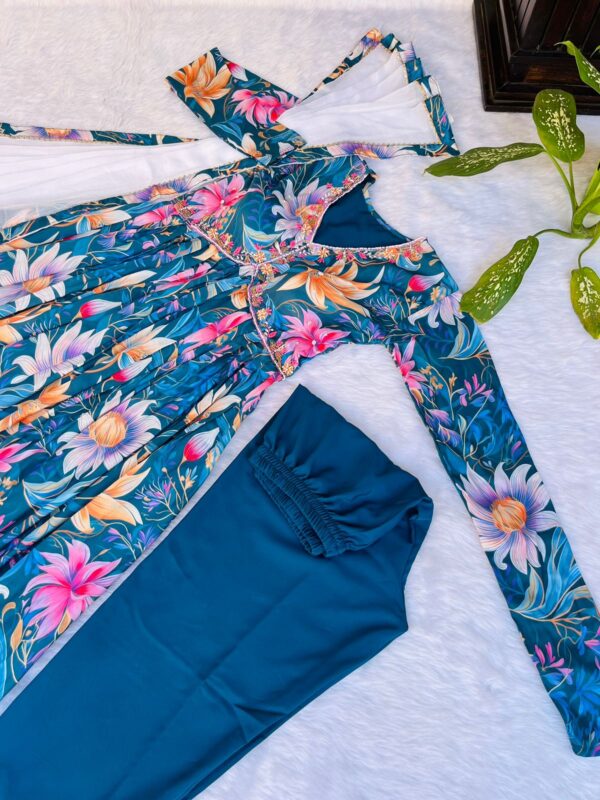 👗Dress Cotton BSY Soft With Digital Lily 💐Printed Blue Color Beautiful Hand made katli and White Paul’s, Thread Flair 3.5 MTR approx 🪷 Sleeve Length 25 +